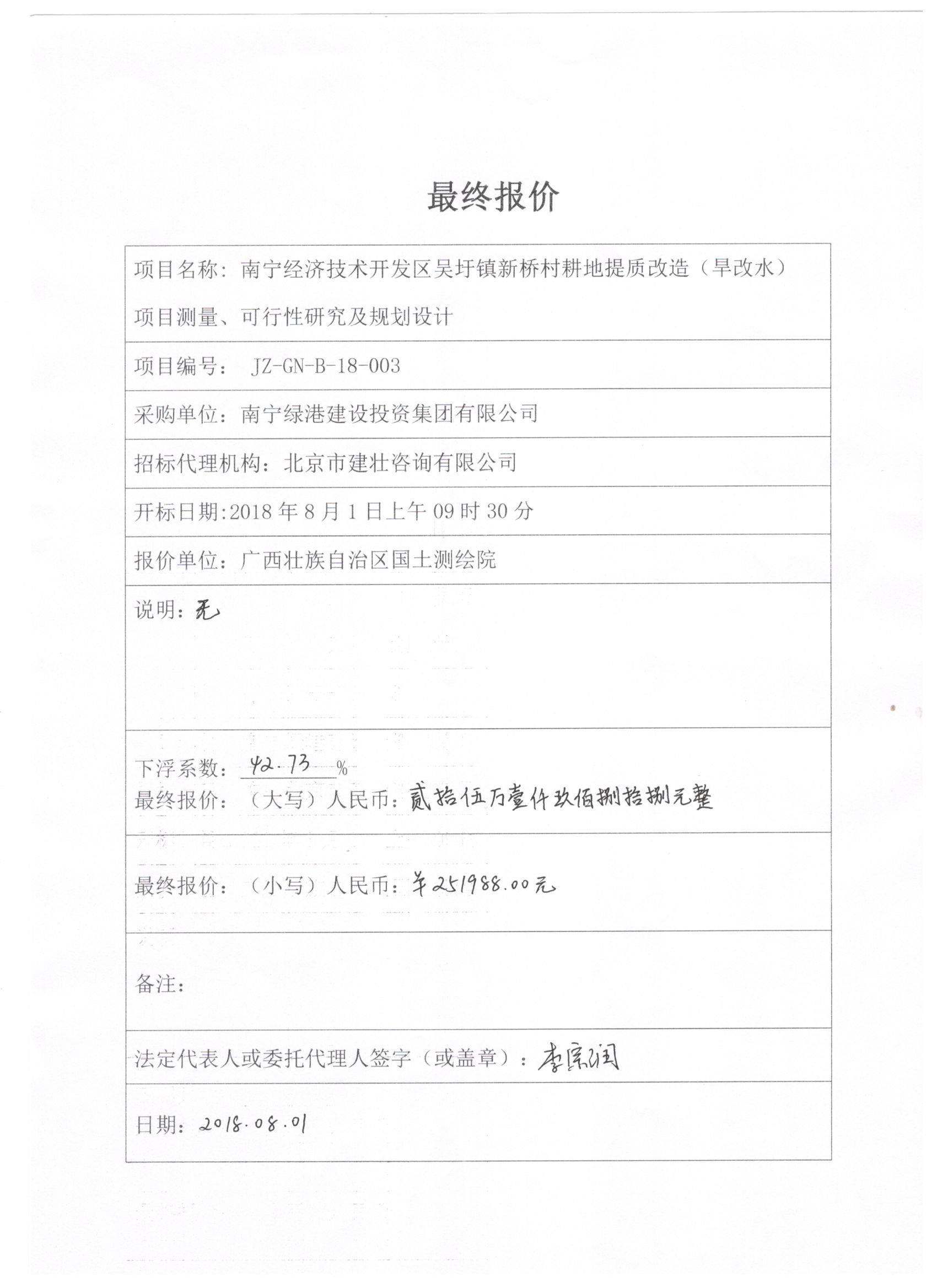 北京市建壯咨詢有限公司受南寧綠港建設(shè)投資集團有限公司委托,根據(jù)《中華人民共和國政府采購法》等有關(guān)規(guī)定,于2018年8月1日就南寧經(jīng)濟技術(shù)開發(fā)區(qū)吳圩鎮(zhèn)新橋村耕地提質(zhì)改造(旱改水)項目測量、可行性研究及規(guī)劃設(shè)計以競爭性磋商方式進行采購,現(xiàn)就本次采購的成交結(jié)果公告如下: