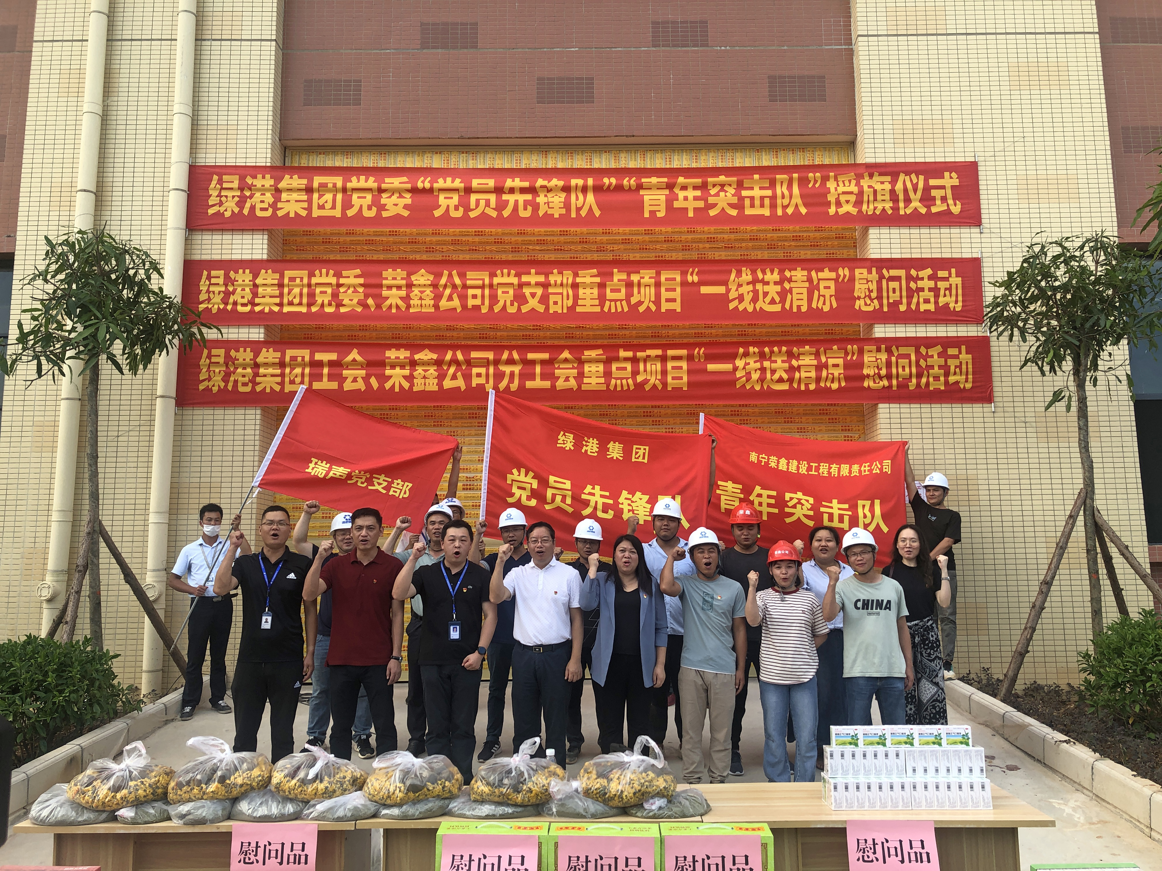 7月14日,由綠港集團(tuán)黨委主辦,榮鑫公司黨支部、榮鑫公司工會(huì)承辦的 “黨員先鋒隊(duì)”“青年突擊隊(duì)”授旗暨“一線送清涼”活動(dòng)在瑞聲三期項(xiàng)目現(xiàn)場(chǎng)開展。榮鑫公司黨支部書記、總經(jīng)理李汝埠帶領(lǐng)榮鑫公司領(lǐng)導(dǎo)班子,頂著烈日、迎著熱浪,來到集團(tuán)重點(diǎn)項(xiàng)目——瑞聲科技(南寧)廠房裝修工程(三期)施工現(xiàn)場(chǎng),親切看望慰問在炎炎夏日中奮戰(zhàn)在項(xiàng)目建設(shè)一線的“黨員先鋒隊(duì)”“青年突擊隊(duì)”隊(duì)員及各施工班組的建設(shè)者,送去了集團(tuán)黨委、榮鑫公司黨支部、榮鑫公司工會(huì)的關(guān)心和敬意,為他們加油鼓勁、提振士氣。瑞聲科技(南寧)有限公司副總經(jīng)理李博及項(xiàng)目相關(guān)負(fù)責(zé)人參加活動(dòng)。